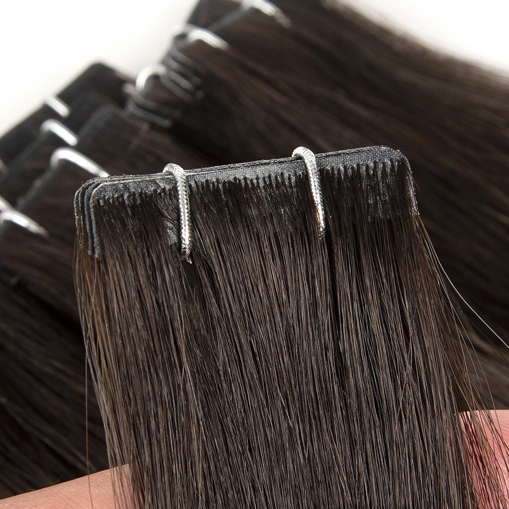 Installed using the sandwich method — one tape weft placed above and one below a small section of natural hair. The root-mimicking top makes them ideal for visible areas like partings or hairlines.